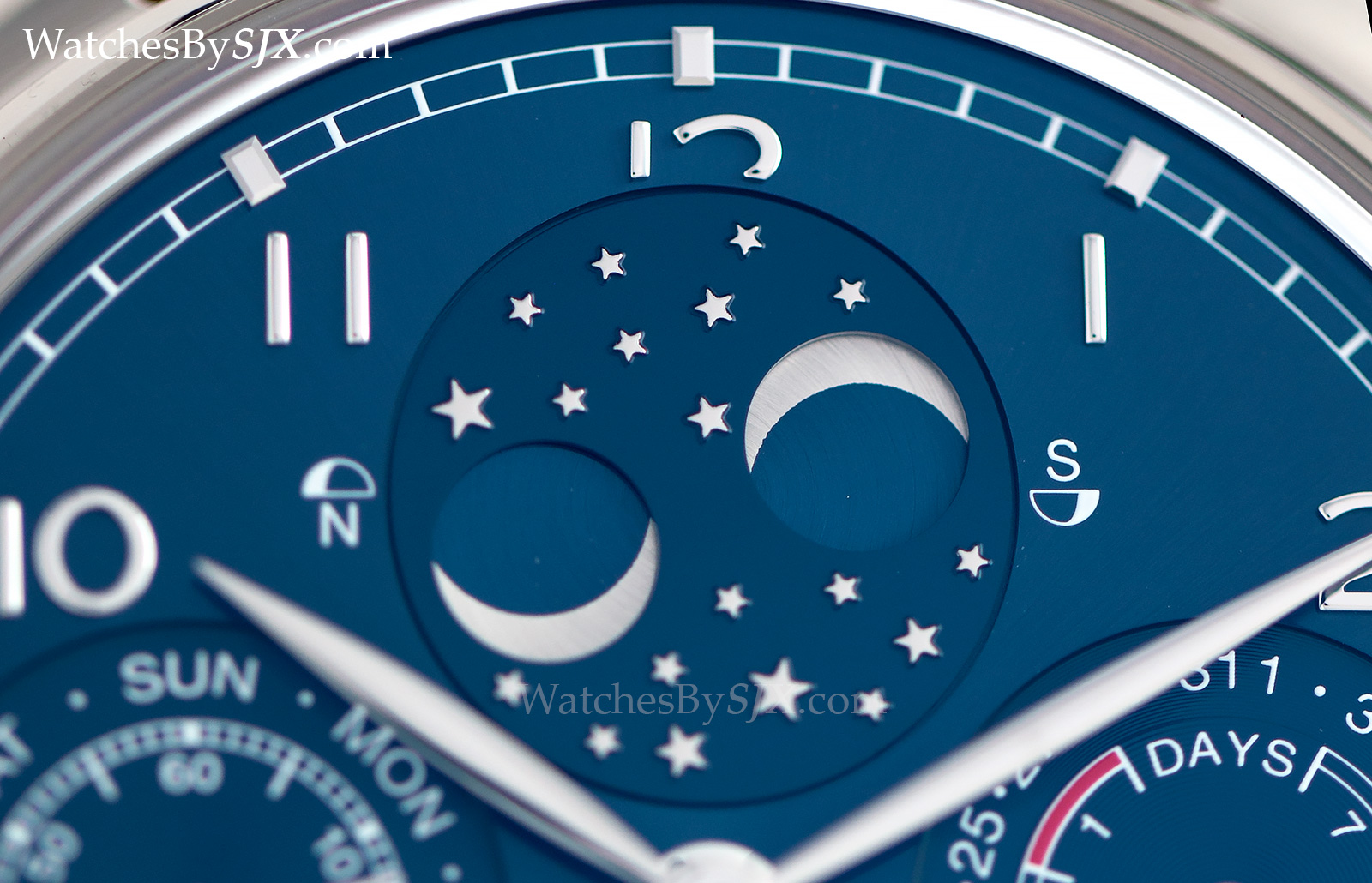 Die einzigen Optionen sind Ziffernfarben und die Mondphase - entweder die traditionelle Einzelmondanzeige oder die Doppel-Halbkugel, Doppelmondphase. Unabhängig von der Art der Mondphase wurde dem Mondschein ein liberales Streuen von Sternen hinzugefügt. Es ist ein subtiles Detail, aber macht das Zifferblatt ein wenig weniger staid.